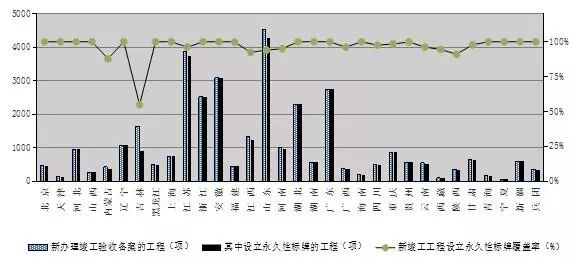 2017年二季度,全国新办理竣工验收备案工程34186项,其中有32707项工程设立永久性标牌,覆盖率为95.67%,安徽、广东、浙江等16个省(区、市)和新疆生产建设兵团覆盖率达100%;有29791项工程建立质量信用档案,覆盖率为87.14%,安徽、浙江、上海等10个省(区、市)覆盖率达100%。