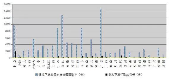 2017年二季度,各地共下发监督执法检查整改单118609份、行政处罚书7219份,处罚相关单位6236个,处罚相关人员1780名。其中省级住房城乡建设主管部门下发监督执法检查整改单2951份、行政处罚书1044份,处罚相关单位741个,处罚相关人员134名;市县级住房城乡建设主管部门下发监督执法检查整改单115658份、行政处罚书6175份,处罚相关单位5495个,处罚相关人员1646名。从行政处罚数量看,北京、重庆、山东3省(市)处罚力度较大。
