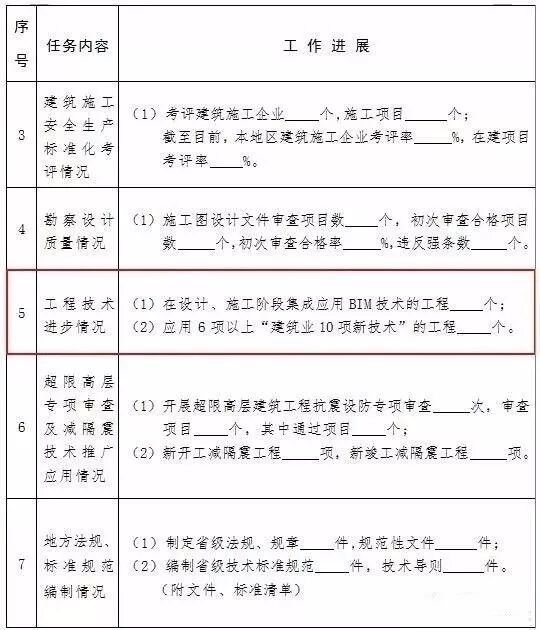 住建部为推进全国提升行动顺利实施,推动信息化标准建设,于17年第二季度开始,要求各省按季度报送工程质量安全提升行动进展情况,每季度填报并全国公示。颁布通知中,住建部把BIM技术单独立项填报,《工程质量安全提升行动季度报表》中明确列出工程技术进步情况一项: